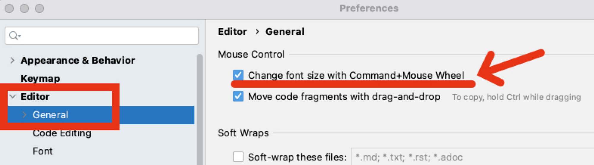 설정 창에서 Editor - General 의 "Change font size ..." 옵션 체크!